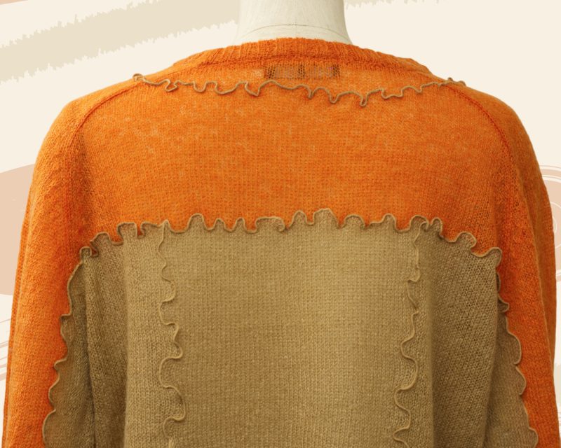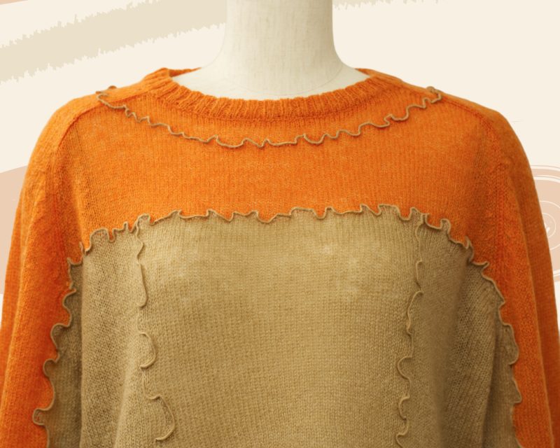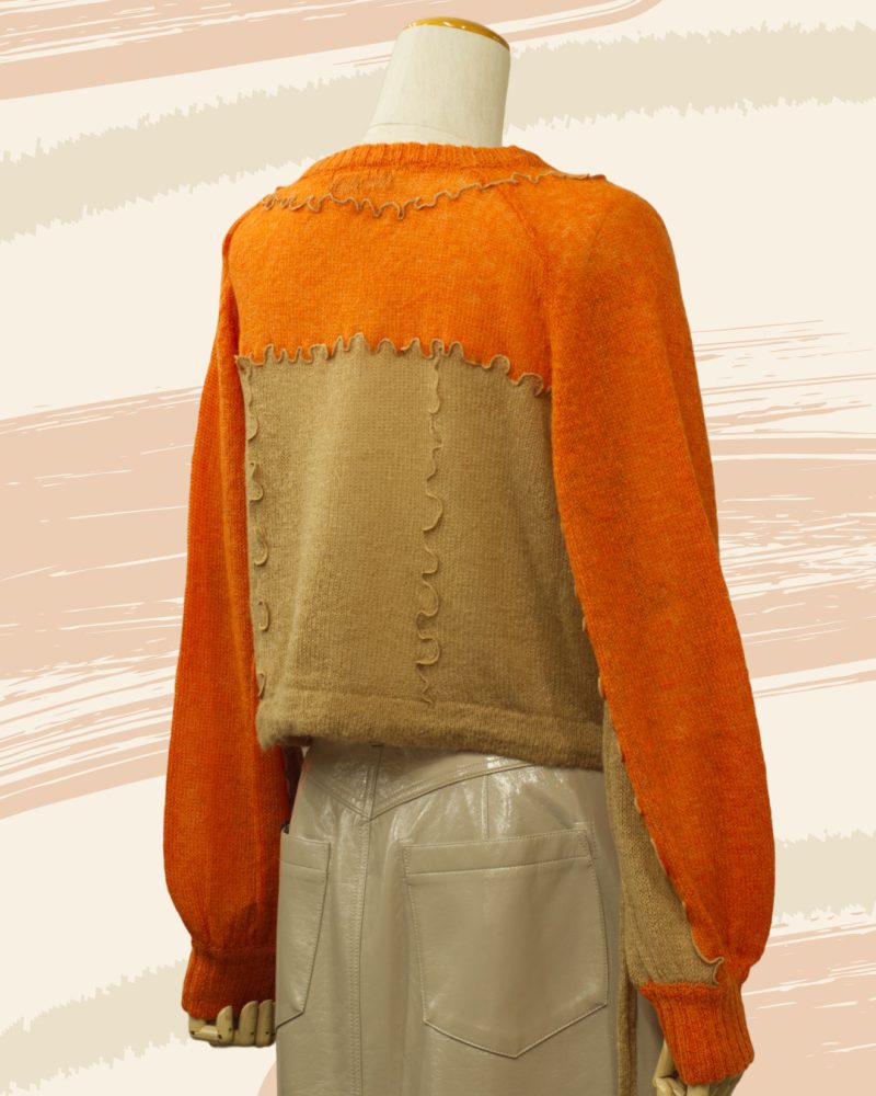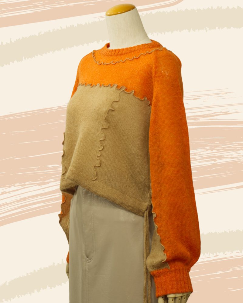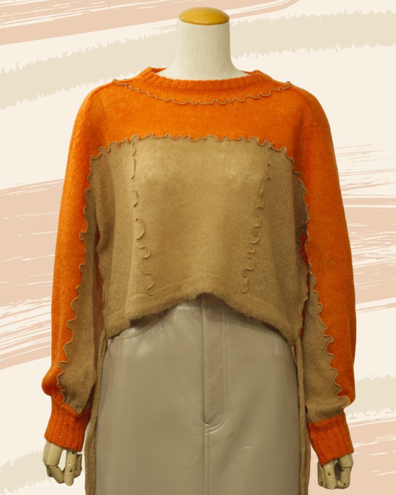やわらかな透け感と、波打つようなメロウ仕立てが印象的な 「シアーメロウニット」。 オレンジのあたたかな発色に、ベージュのシアー素材を重ねることで、 一枚でレイヤードスタイルが完成する、奥行きのあるデザインに仕上がっています。 編み目からほんのりと空気を含んだような軽やかさが伝わり、 冬のはじまりから春先まで、季節の移ろいに寄り添う一着です。 メロウ仕上げの縁取りが、甘すぎず、けれどしっかりと表情を添え、 ナチュラルな中にも、さりげないデザイン性を感じさせてくれます。 ショート丈なので、 ワイドパンツやスカートともバランスがとりやすく、 重ね着を楽しみたい大人の方にこそおすすめしたいニットです。