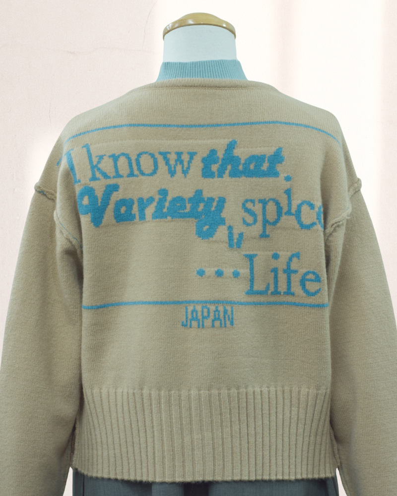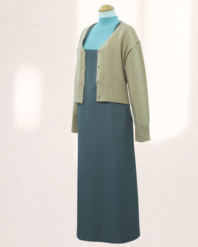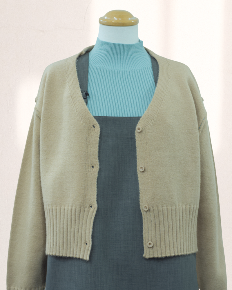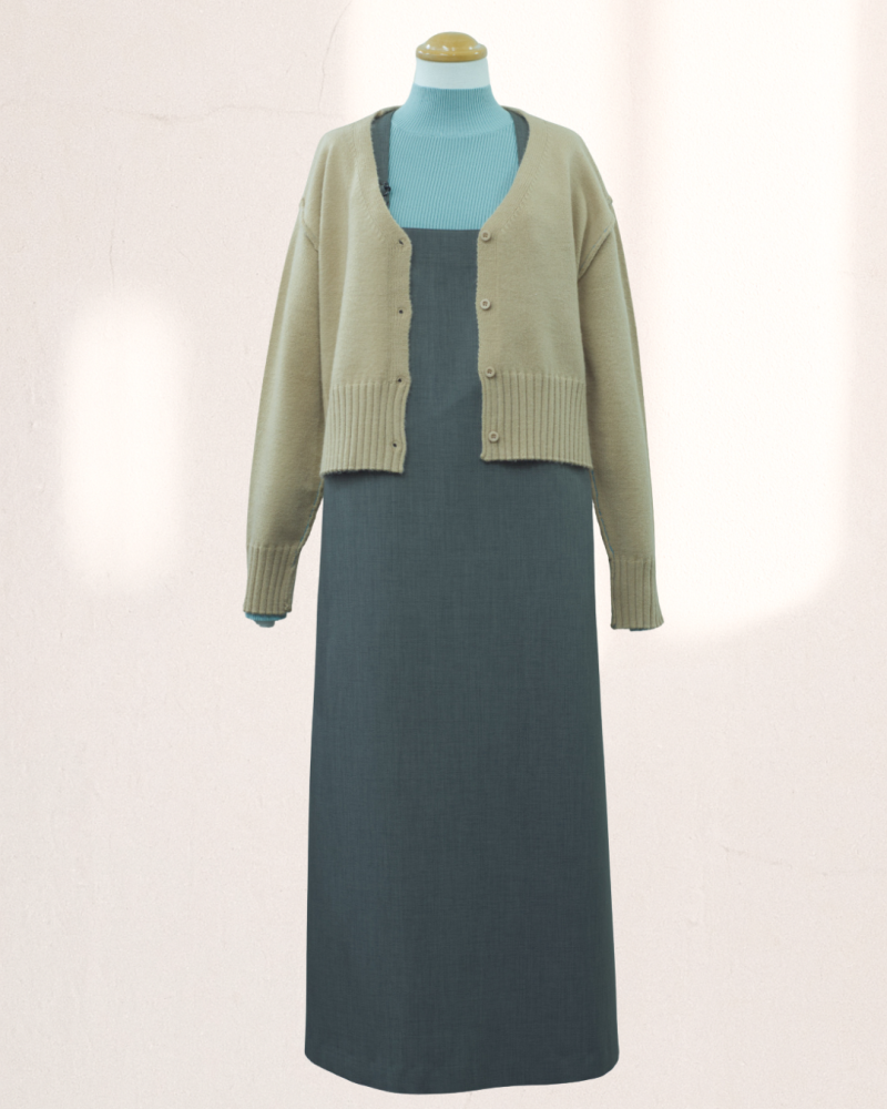 【肩ひもや胸当てのデザインがはっきりしていて、 インナー次第で印象が変えられるのがジャンパースカートの魅力。 一枚で着ても、重ねても、 「今日はどう着ようかな」と考える時間まで楽しくなるアイテムです。 今回は、インナーにリブの効いたトップスを合わせ、 その上からショート丈のカーディガンを重ねました。 腰位置が上がって見えるので、 ジャンパースカートの縦ラインがよりきれいに出ます。 ベージュのカーディガンは、 今の気分に合うショート丈。 前から見るとシンプルですが、 背中にはさりげなくロゴが入っていて、 後ろ姿に少しだけ遊び心を添えてくれます。 ジャンパースカートが持つ安心感に、 ショート丈とロゴで今っぽさをプラスしたスタイリング。 「ジャンスカが好き」という方にも、 「いつもと少し違う着方をしてみたい」という方にも、 おすすめしたい組み合わせです。】