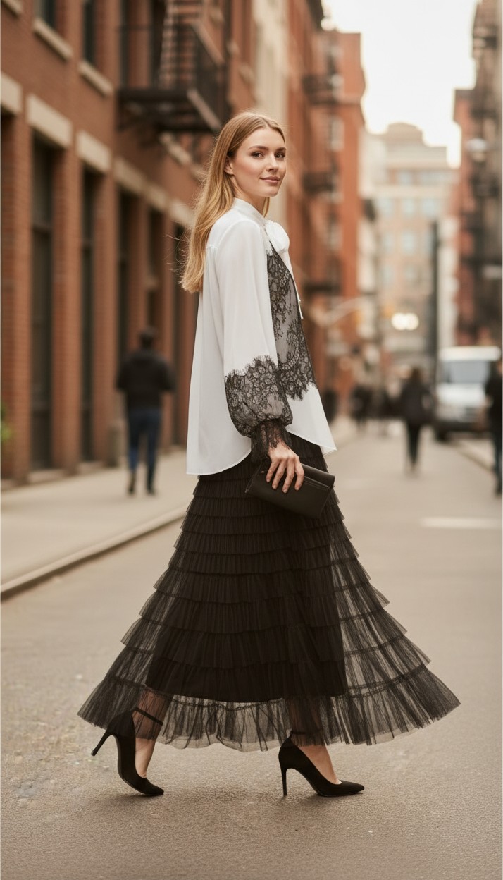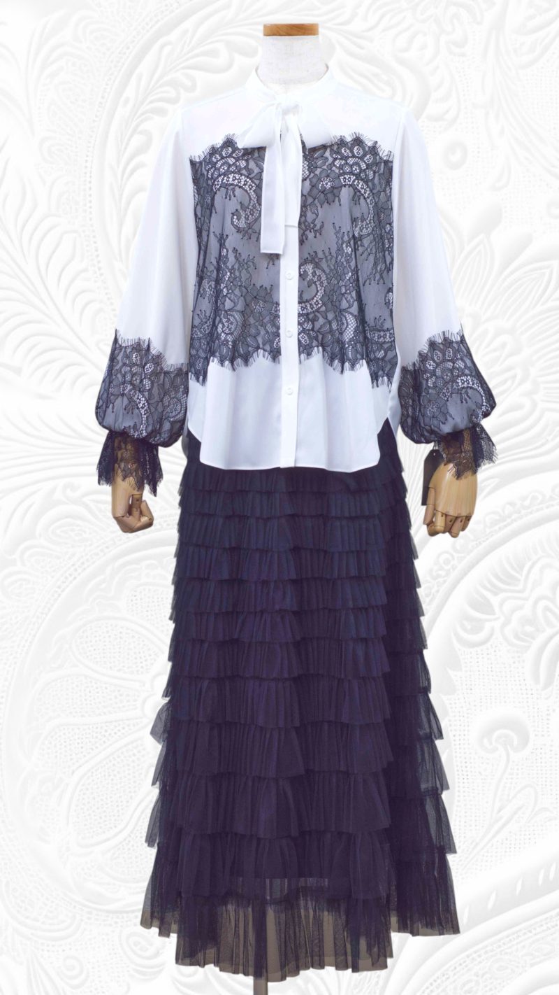 【春の光にふれると、白いブラウスがいちばん綺麗に見える季節ですね。 今日の主役は、そんな“白”に黒レースを添えた、上品で気分の上がる一枚なんです。 レースの柄が細かくて、線がとても繊細だから、 白×黒のコントラストが“強さ”ではなく“品”として映るんですよね。 生地にぴったり貼り付けず、ほんの少し浮かせて縫われていることで、 影がふわっと柔らかく落ちて、動くたびに表情が変わるのも素敵で。 レースがブラウスとは別の動きをしてくれるから、 甘さが古くならず、軽やかで大人っぽい可愛さが生まれるんです。 袖口はゴム仕様なので、たくし上げるとレースがふわりと広がって、 下ろすと繊細に揺れる。そのどちらも上品で、気分に合わせて楽しめますよ。 リボンタイは太すぎず細すぎず、 甘さの方向性を“今の空気”に寄せてくれる絶妙なバランス。 レースの可愛さを引き立てながら、全体を大人っぽくまとめてくれます。 白と黒の組み合わせなのに、地味でも強すぎでもなく、 ただただ上品で、大人の可愛さがふわっと香るブラウス。 春の光にいちばん似合う一枚だと思います。】